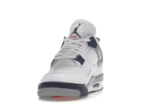 The Air Jordan 4 Retro White Midnight Navy dresses in white, midnight navy, and light smoke grey colorway.